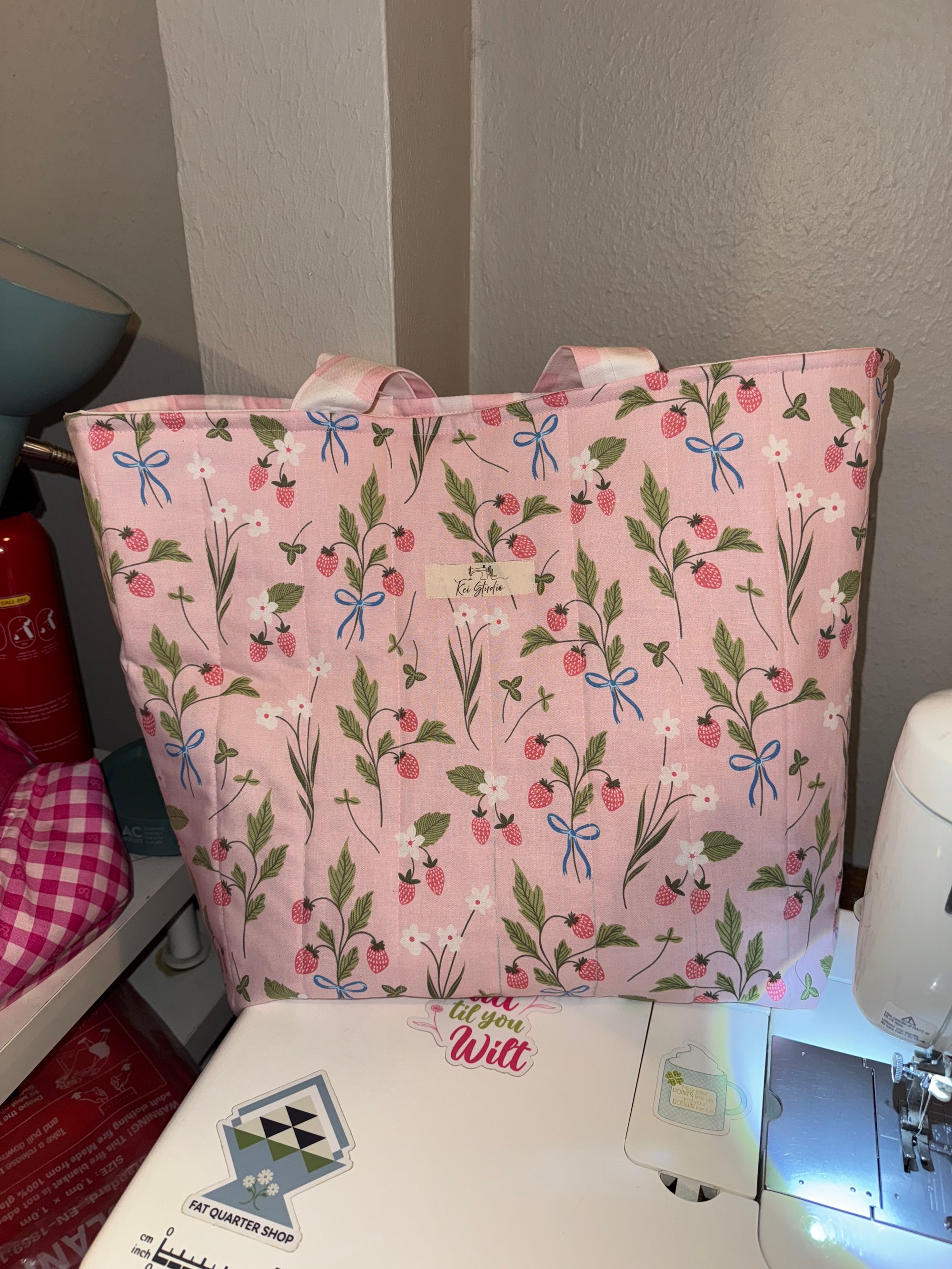 This handcrafted quilted tote bag features a charming strawberry bow design with a convenient inside pocket and a secure, magnetic snap closure. This tote is perfect for carrying every day essentials with a touch of cuteness.